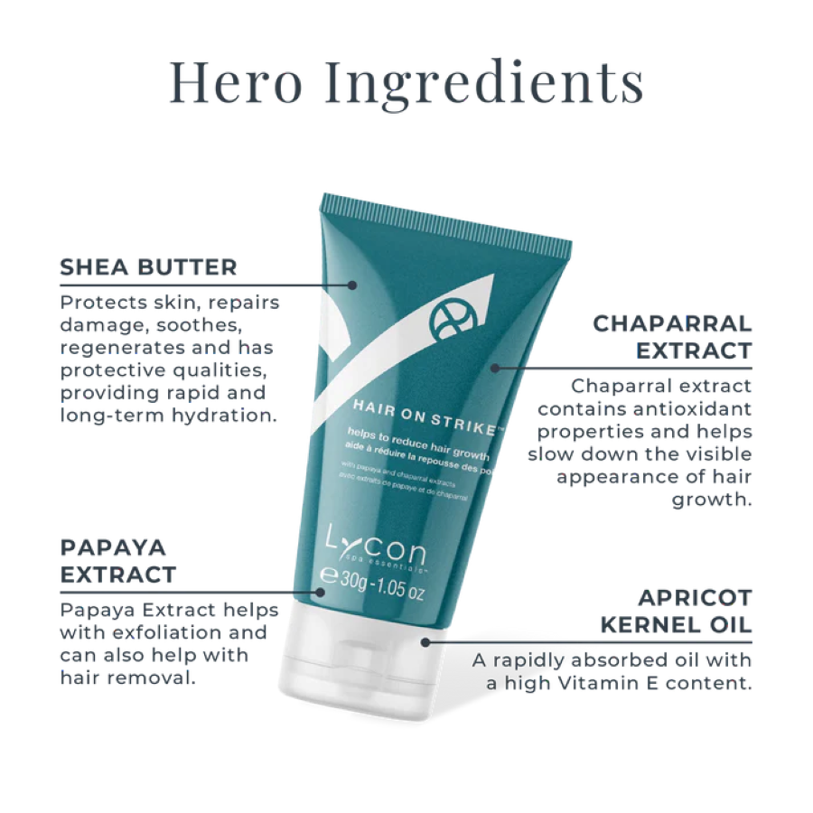 Ervaar Lycon’s krachtige Hair On Strike, een verzachtende crème met haargroei-vertragend effect. De formule met Papaya- en Chaparral-extract vermindert zichtbaar terugkerende haartjes, maakt de huid gladder én kalmeert na het ontharen. Perfect na waxen, scheren of ontharingscrème – ideaal voor bovenlip, kin, oksels, bikinilijn en navel.